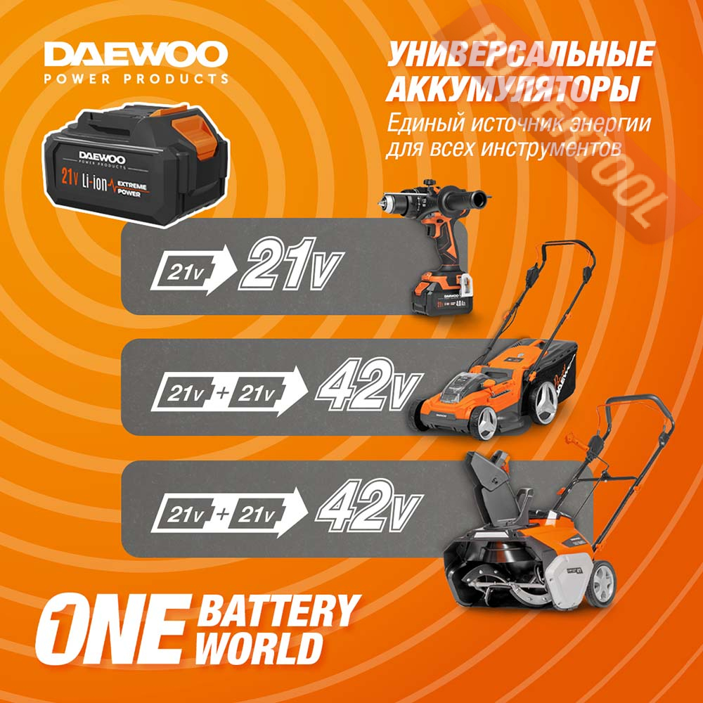 • 21В Li-ion единая платформа. Модель совместима со всеми аккумуляторными инструментами и батареями DAEWOO линейки 21В.
