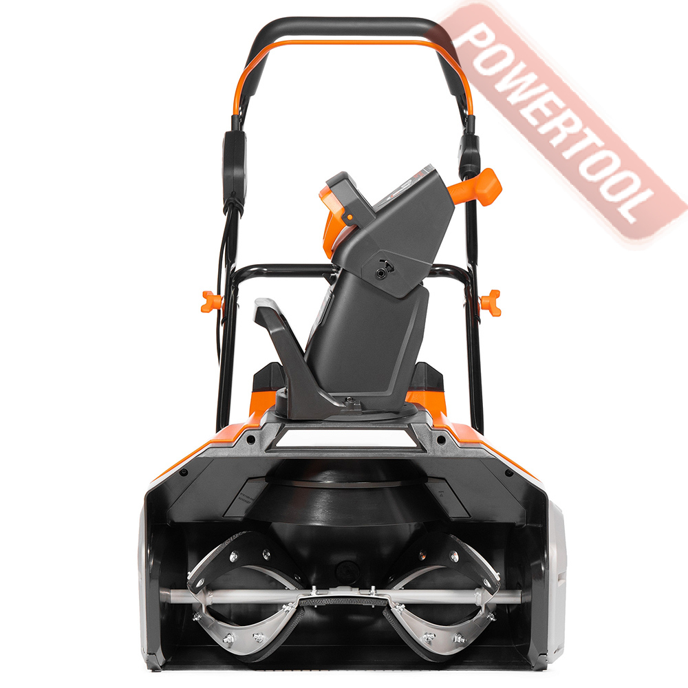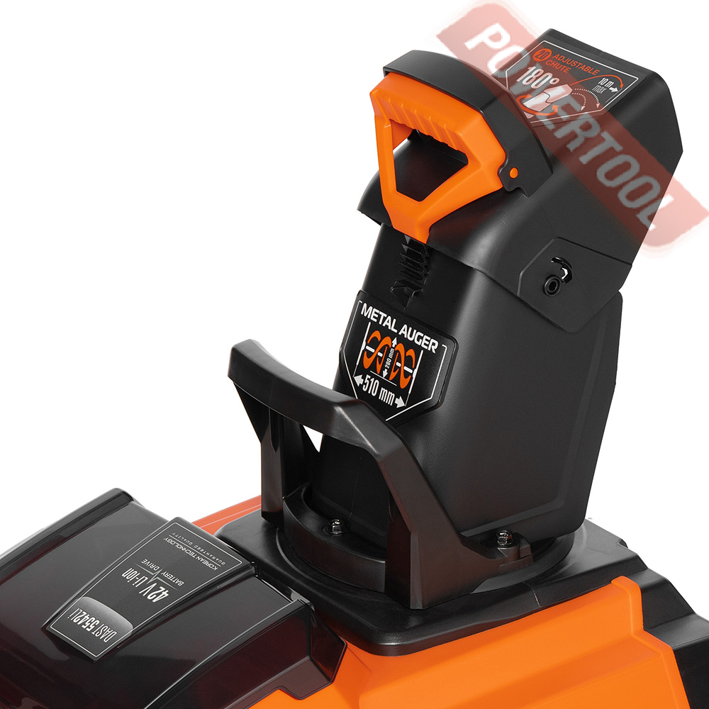 Снегоуборщик аккумуляторный несамоходный, ширина ковша 51 см, высота ковша 28 см, бесщеточный двигатель, 2000 об/мин, аккумулятор Li-ion 42 (21 х 2) В, выбор направления выброса снега вращением боковой рукоятки, угол поворота желоба 180 градусов, выбор дальности выброса снега вручную на желобе и достигает до 10 м, материал желоба пластик, резино-металлический шнек, ударопрочный корпус ABS, LED фара, колеса, габариты упаковки 645х575х440 мм, вес 18 кг, два аккумулятора 5 Ач и ЗУ.