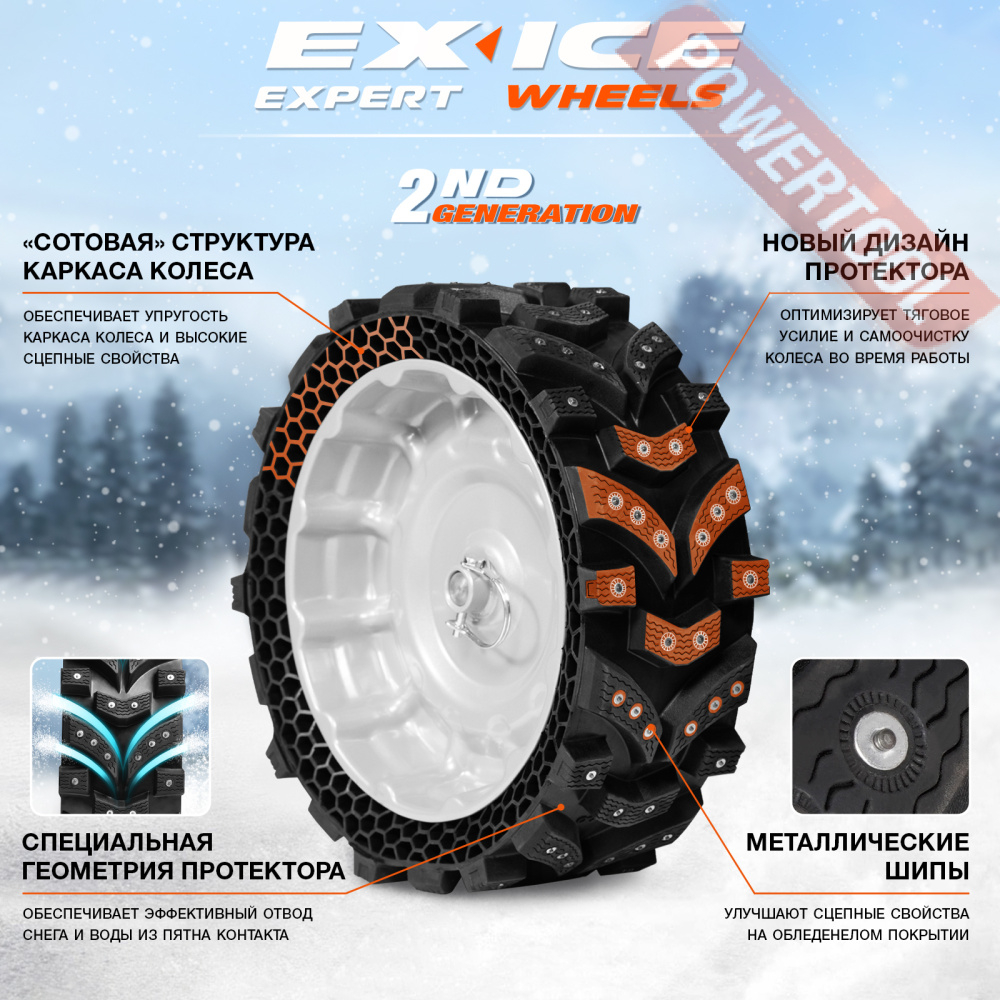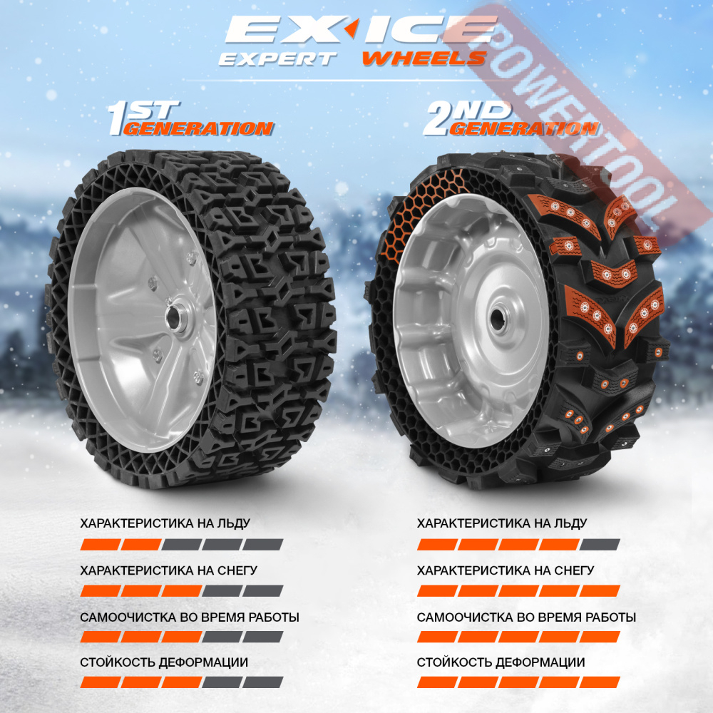 • Уникальные колеса EX ICE WHEELS. Широкие безвоздушные колеса созданы специально для снегоуборщиков. Колеса EX ICE обладают лучшим сцеплением с поверхностью среди всех зимних шин. Лучшая проходимость и маневренность в классе снегоуборщиков.