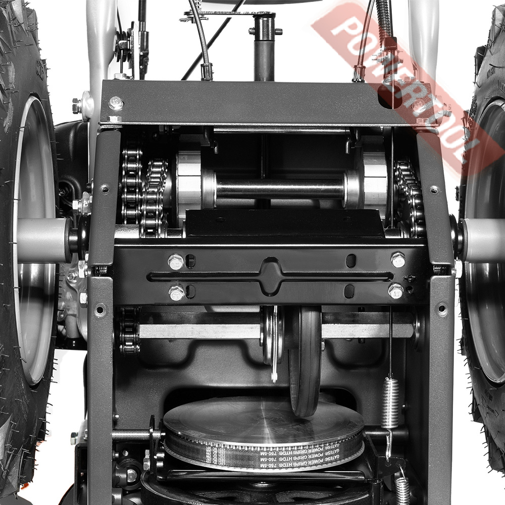 - Трансмиссия DISC-O-MATIC 6+2. Система обеспечивает выбор скоростей: 6 скоростей вперед и 2 скорости назад, в зависимости от высоты снежного покрова. Простая и одновременно надежная система перемещения фрикционного диска для изменения скорости.
