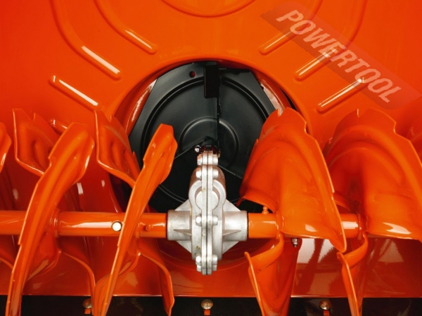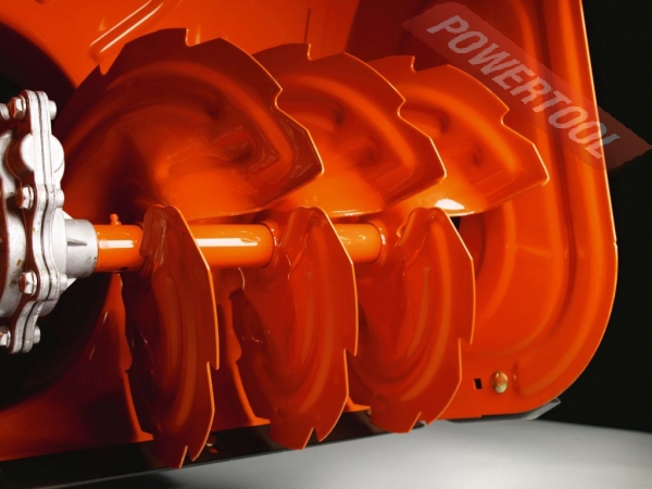 - Двухступенчатая система. Снег подается в кожух шнеком и затем выбрасывается крыльчаткой через желоб.