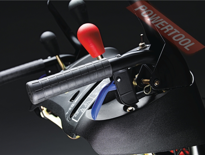 - Управление поворотом регулируется двумя курками под рукоятками. Конструкция снегоочистителя позволяет отключать блокировку с выбором ведущего колеса посредством сервопривода, что облегчает маневрирование и управление техникой.