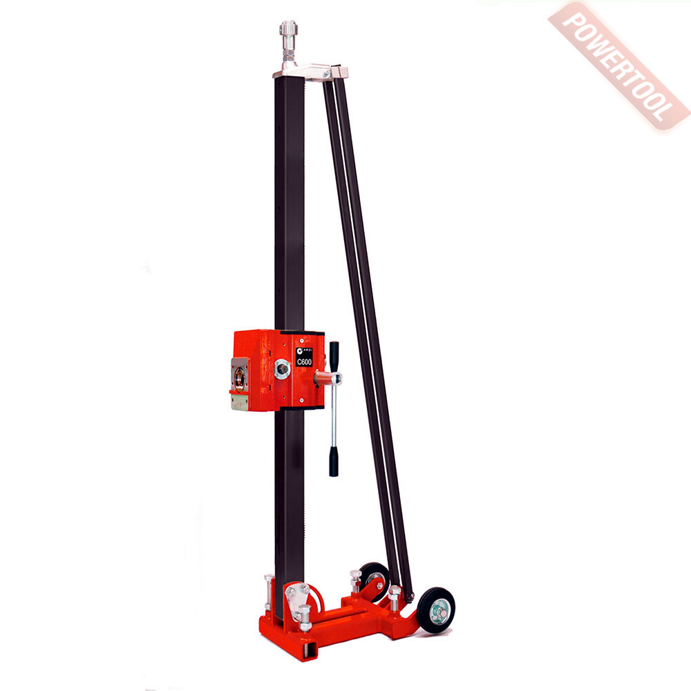Стойка установки алмазного бурения CARDI C600-1500, которая имеет основание станины из стального профиля, отличается надежностью и удобством в эксплуатации за счет 4 регулировочных болтов и транспортировочных колес. За счет быстросъемного крепления, двигатель с легкостью устанавливается на стойку, а стальная колонна может выдержать достаточно высокие нагрузки. Передвижение каретки осуществляется с помощью роликового механизма по стальной зубчатой рейке. Сверление возможно под углом 0-75 градусов. Благодаря задней опоре, станина становится более жесткой, что очень важно для сверления.
