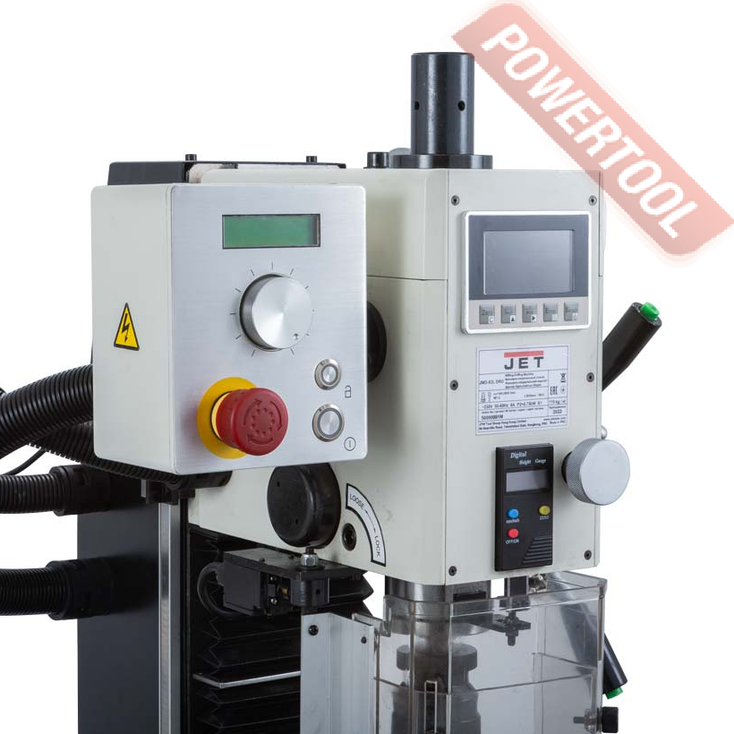 Моторная группа станка JET JMD-X2L DRO представлена бесколлекторным двигателем мощностью 750 Вт. Управление работой двигателя осуществляется с панели управления, расположенного с левой стороны сверлильной головки. Двигатель имеет плавную регулировку частоты вращения. Диапазон частоты вращения составляет 100-2000 об/мин и регулируется потенциометром. Включение режима резьбонарезания осуществляется кнопкой на передней панели, а включение реверса – зеленой кнопкой на конце рукоятки штурвала опускания пиноли шпинделя.
