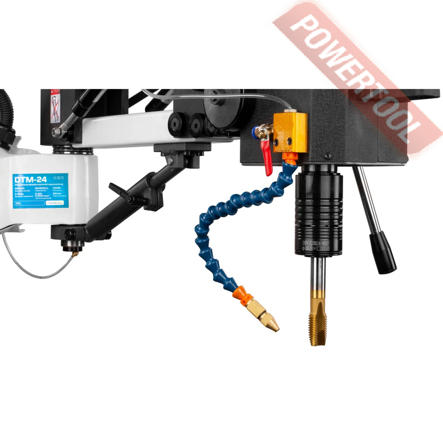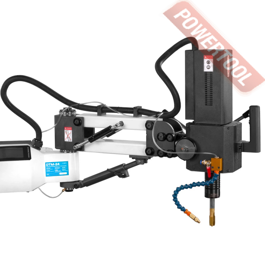 Сверлильно-резьбонарезной манипулятор, 1200 Вт, 220 В, max диаметр сверления 16 мм, max нарезаемая резьба M24, частота вращения шпинделя 0-3000 об/мин, 2 передачи, бесступенчатая регулировка оборотов, индикация числа оборотов, режимы ручной/авто/нарезка глубокой резьбы, посадочное сверлильного патрона B16, диапазон хвостовиков для патрона 3-16 мм, рабочий радиус поворота рычага 920 мм, в комплекте патрон ключевой B16 3-16 мм, оправка GTM-24/B16, набор резьбонарезных головок GTM-24 DIN 371 М5-М6/М8/М10, DIN 376 М12/M16/M18/M22-M24 с ключом, стойка опорная, крепежные принадлежности, система СОЖ.