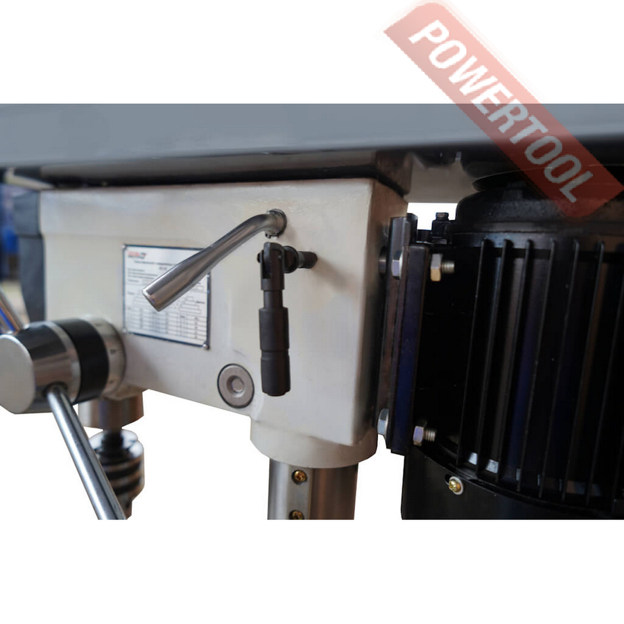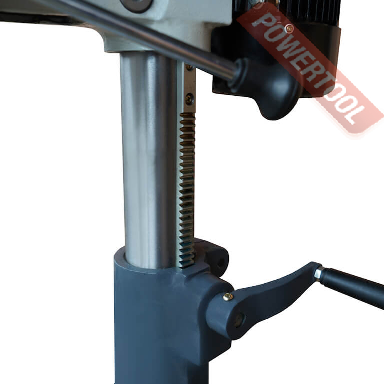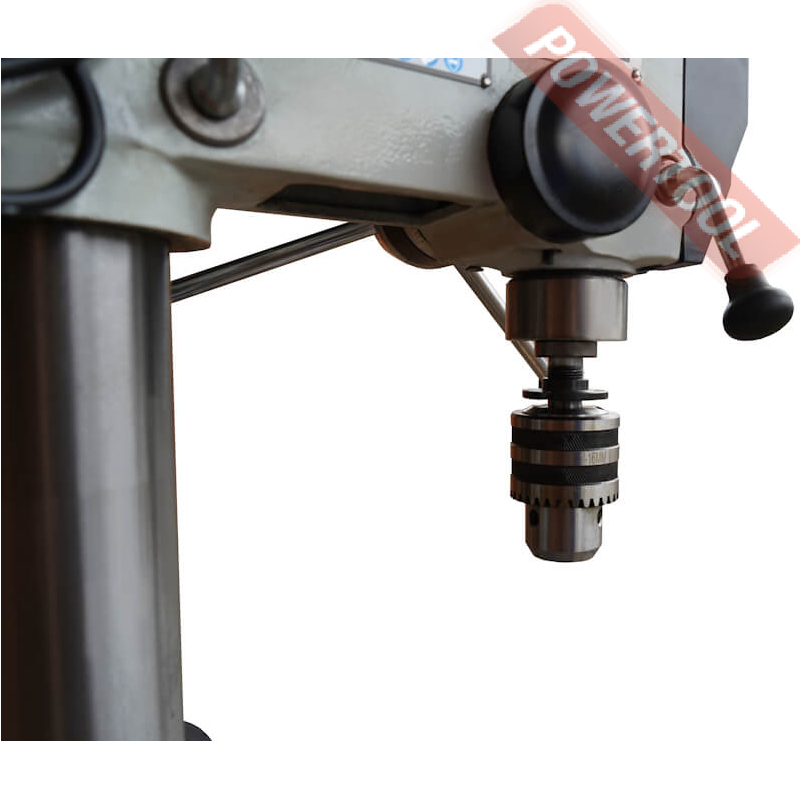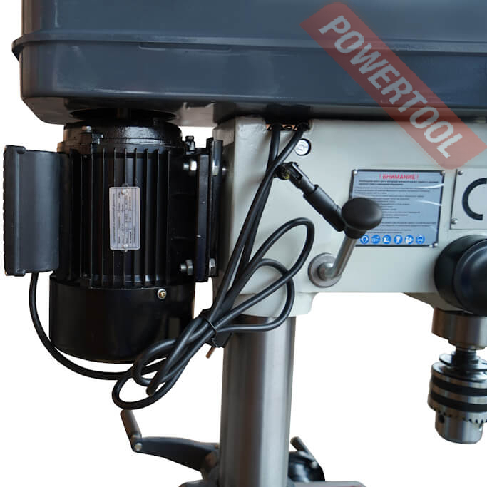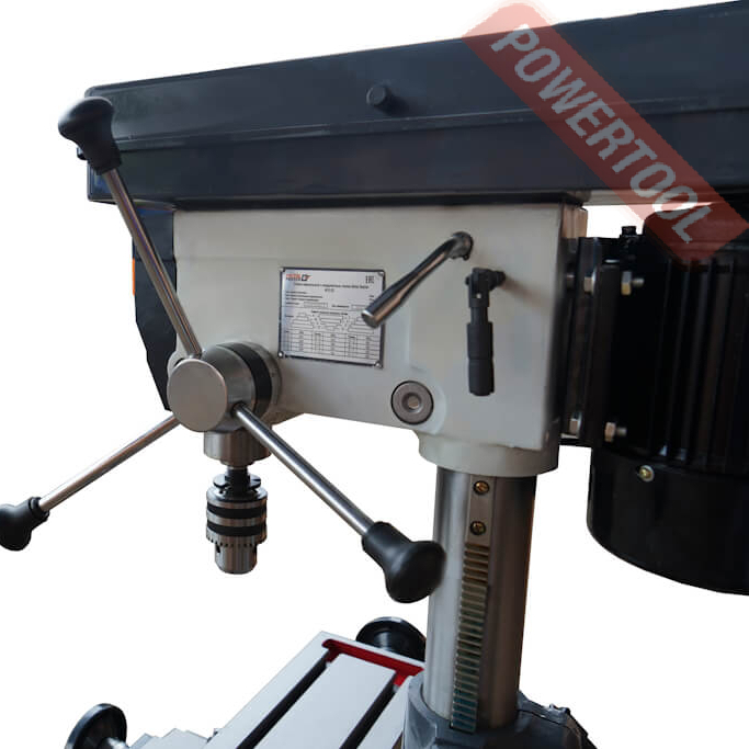 С передней стороны сверлильной головы расположены кнопки включения и выключения станка. С правой стороны сверлильной головы расположена трехлучевая рукоятка опускания пиноли с нониусом. Ход пиноли станка составляет 80 мм. Конус пиноли МТ2. Вылет пиноли можно зафиксировать в нужном положении при помощи рукоятки, которая расположена с левой стороны станка. Высота сверлильной головы устанавливается с помощью вращения рукоятки, перемещение осуществляется по зубчатой рейке. В стандартную комплектацию входят: сверлильный патрон, ключ патрона, шестигранный ключ, инструкция на русском языке.