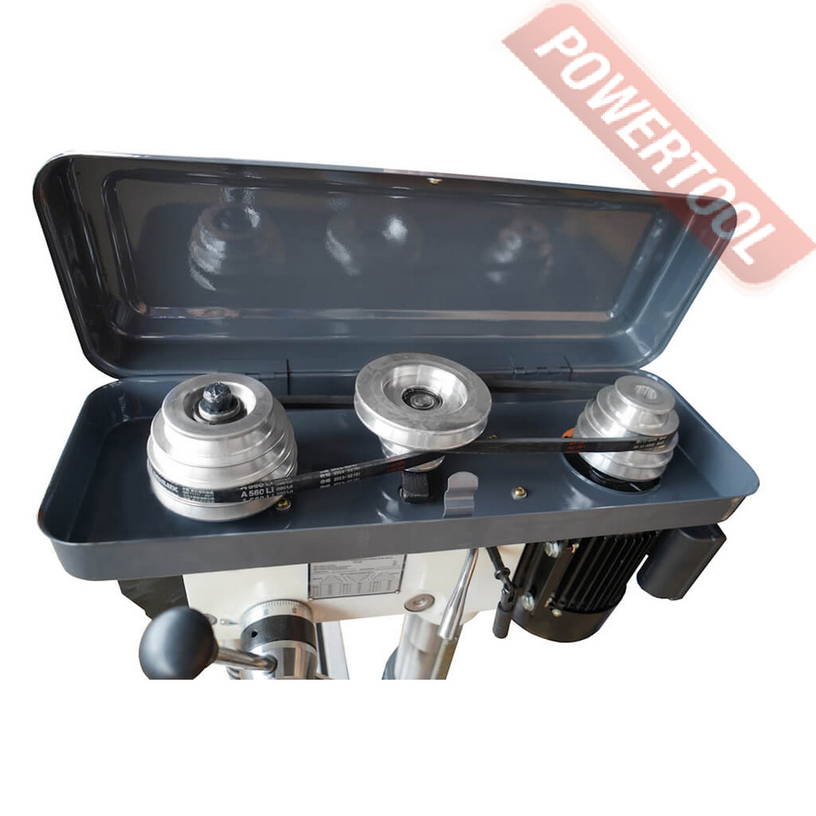 Скорость вращения шпинделя регулируется с помощью перекидывания ремней в блоке ременных шкивов. Схема положения ремней с диапазоном оборотов расположена с правой стороны станка. Широкий диапазон оборотов шпинделя от 320 до 3300 об/мин обеспечивает качественное сверление материалов.