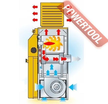 - Непрямой нагрев. Нагреватель имеет дымоотвод, через который удаляются продукты сгорания. Камера сгорания отделена от воздушного потока, а нагрев воздуха производится благодаря теплообменнику. Таким образом, в обогреваемое помещение поступает поток чистого горячего воздуха, а продукты сгорания выводятся наружу. Такой тип обогрева имеет КПД ниже, чем у нагревателей прямого типа, но может использоваться в помещениях с людьми.