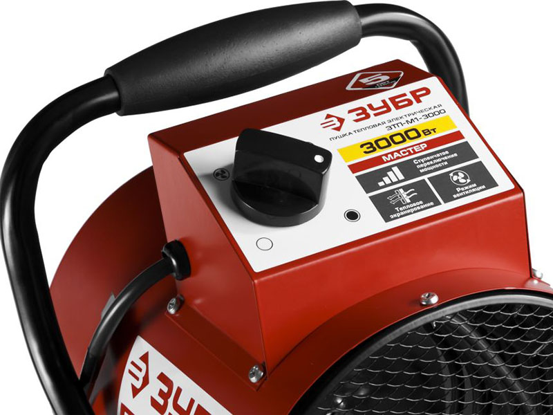 Тепловая пушка электрическая ЗУБР ЗТП-М1-3000 - надежный экономичный обогреватель для квартиры и загородного дома. Большая площадь ТЭНов из нержавеющей стали и эффективный обдув способствуют более быстрому нагреву помещения без выжигания кислорода. Безопасность обеспечена дополнительным защитным кожухом, термопредохранителем, капиллярным терморегулятором и заземлением корпуса. Оптимальна для работы на объектах и в помещениях до 35 м.кв. Это устройство позволяет создать приемлемые климатические условия в помещениях даже с полным отсутствием иных источников отопления. Конструкция надежна и практична. Запуск производится путем переключения регулировочного реле. Обеспечивает чистый, быстрый и безопасный нагрев, идеален в качестве временного или экстренного средства обогрева благодаря простоте эксплуатации и мобильности. Процесс эксплуатации можно охарактеризовать достаточно тихим, при этом отсутствуют какие либо запахи. Нет необходимости заправлять оборудование топливом, достаточно просто произвести подсоединение к сети. Также однозначным достоинством технологии является сбережение кислорода внутри помещения.
