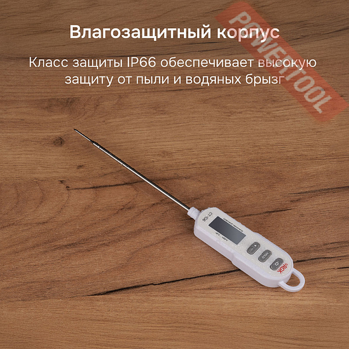 Благодаря водонепроницаемому исполнению корпуса из двухслойного ABS-пластика, который используется в качестве ручки при выполнении работ и соответствует категории пыле-влагозащиты IP66, контактный термометр в случае загрязнения можно мыть под струей воды, без замачивания. Питание измерителя производится от батарейки типа CR2032. Для подвешивания инструмента при неиспользовании предусмотрена полукруглая скоба в верхней части ручки. Также изделие оборудовано магнитным креплением, которое встроено с тыльной стороны корпуса. Защиту зонда в нерабочем положении обеспечивает съемный пластиковый наконечник.