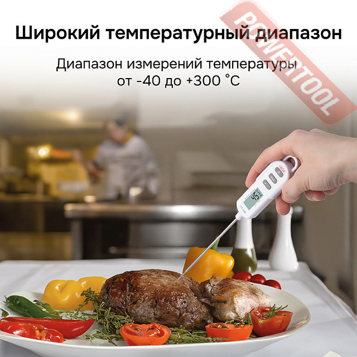 Термометр контактный пищевой RGK CT-106 служит для контактного измерения температурных параметров целевых объектов в пределах от -40 до +300 градусов C, обеспечивая точность ±0,5 градуса С в диапазоне от -20 до +150 градусов С. Инструмент оснащен батарейным питанием и несъемным заостренным и утонченным в передней части погружным зондом, оболочка которого изготовлена из пищевой нержавеющей стали, позволяющим оперативно определять температуру внутри жидких, вязких, сыпучих веществ и материалов, продуктов питания и т.п. Изделие характеризуется высоким быстродействием за счет малого времени отклика и подходит для бытового и профессионального применения.