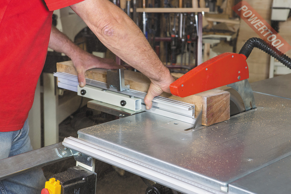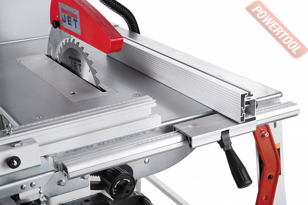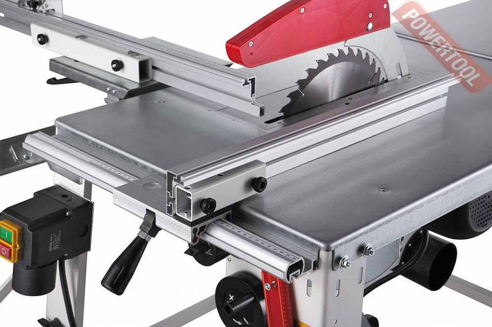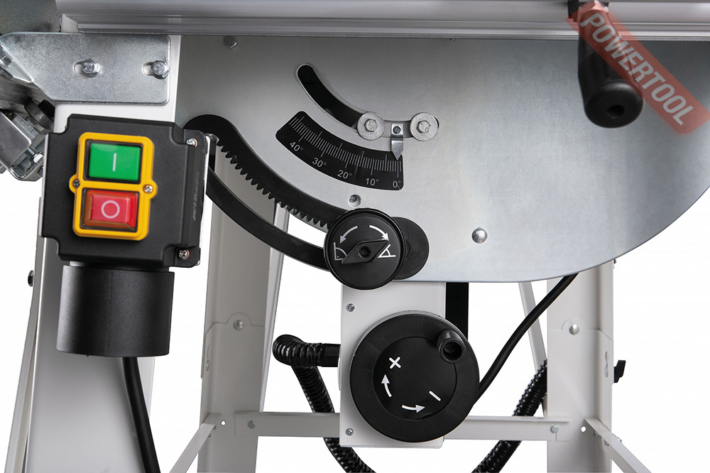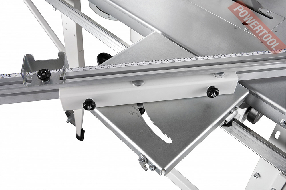 Параллельный упор перемещается вдоль направляющего профиля и имеет эксцентриковый зажим, обеспечивающий быструю и надежную фиксацию. Есть у JTS-315SP и подвижный стол, перемещающийся на роликах-подшипниках вдоль основного. Поверхность каретки невелика, но это отчасти компенсируется длинным упором заготовки, позволяющим добиться точности. Упор можно поворачивать, ориентируясь по транспортирной шкале; если нужна серия коротких изделий, настраивают концевой упор – он «ходит» вдоль основного. В отличие от большинства специализированных строительных пил JTS-315SP имеет регулировку наклона и глубины реза.