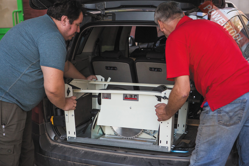 Для облегчения транспортировки опорные ноги складываются примерно на половине высоты, благодаря чему станок легко помещается в багажник легкового автомобиля. Перемещать инструмент по площадке легко в одиночку: колеса, откидные рукоятки и небольшой вес это позволяют. При работе в мастерской или в помещении можно воспользоваться системой аспирации, которая собирает опилки и сверху, и снизу пильного диска, после чего они удаляются системой аспирации через единый 100-миллиметровый патрубок.