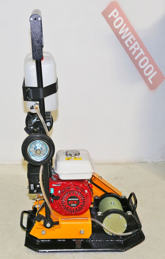 - Для удобства перемещения виброплита оснащается быстросъемными транспортировочными колесами. Также на корпусе есть рукоятки для перемещения аппарата вручную.