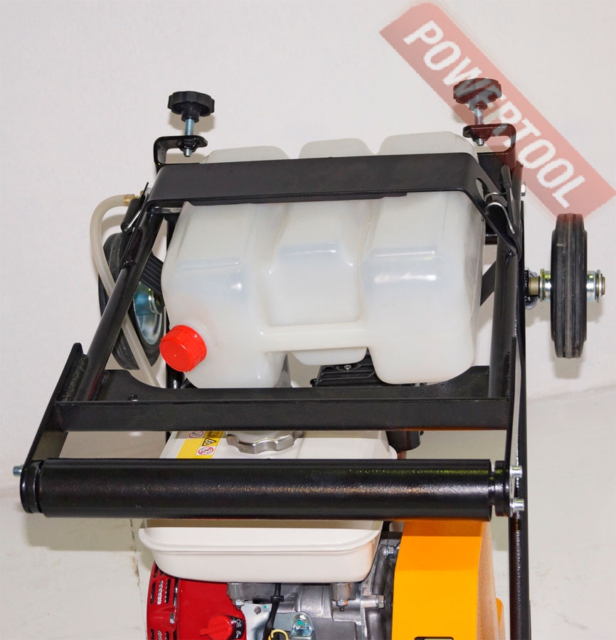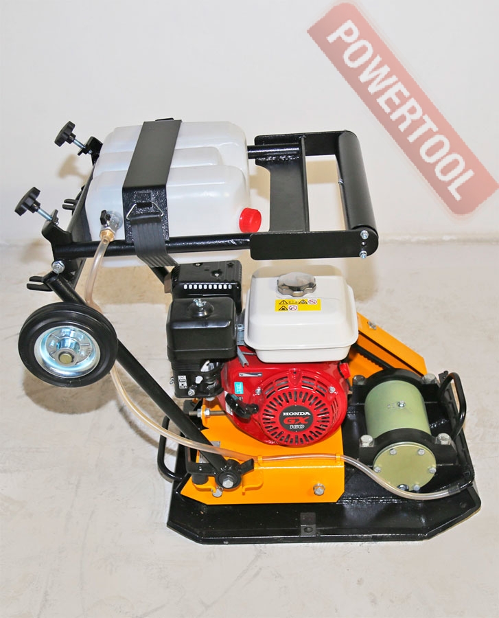 - Для работы по асфальту виброплита оснащена баком для воды объемом 10 л с системой орошения. Бак выполнен из полупрозрачного белого пластика, съемный.