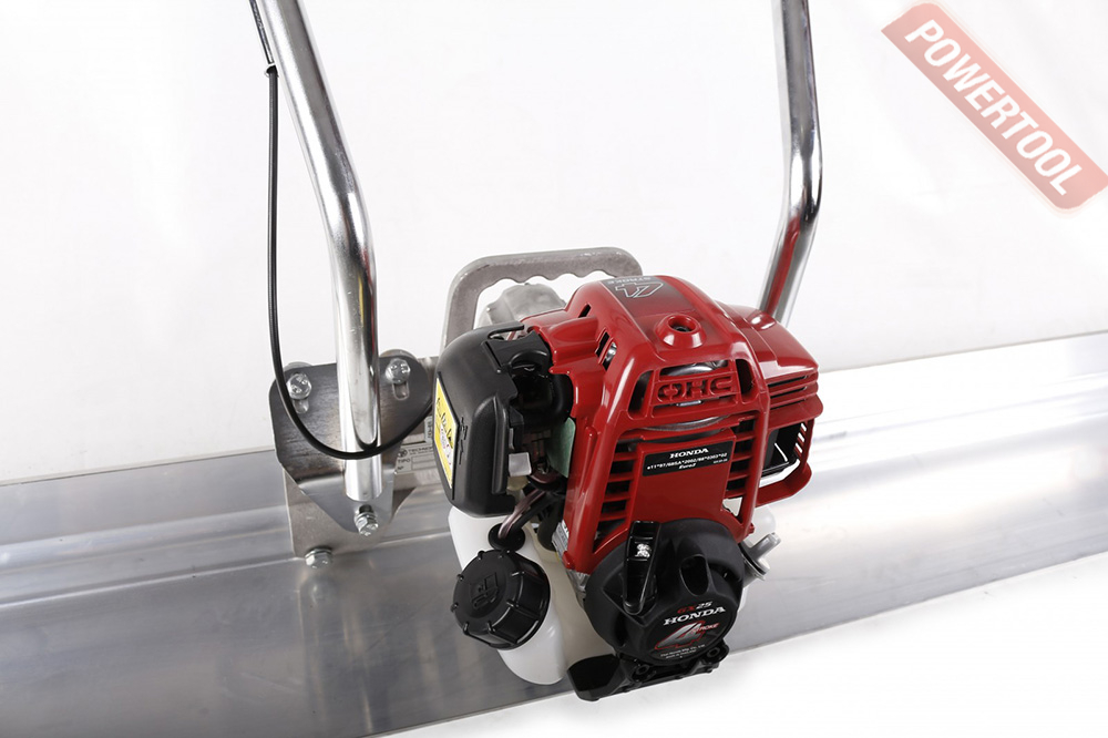 Виброрейка для бетона бензиновая TECHNOFLEX PGH предназначена для уплотнения и выравнивания бетонных смесей при бетонировании дорог, полов, площадок в промышленном и гражданском строительстве. Виброрейки позволяют делать стяжку на бетонных смесях малой влажности (до 20 процентов воды). Уложить такой раствор традиционным способом достаточно трудно, смесь малоподвижна и плохо трамбуется. Под воздействием вибрации рейка сокращает до минимума пористость бетона и позволяет максимально равномерно распределить бетонную смесь. Виброрейка обеспечивает одинаково отличное вибрирование по всей длине лезвия. Главное: можно уложить в 4 раза больше бетона и более аккуратно. Плавающая виброрейка работает по направляющим или без них. Движение рейки обеспечивается за счёт того, что оператор тащит её за рукоятки на себя, а специальный профиль позволяет ей плыть по раствору даже без направляющих рельс-форм. Состоит из бензинового двигателя, топливного бака, алюминиевого профиля разной длины, груза-эксцентрика, расположенного в центре профиля и рукоятки управления. Бензиновый двигатель через приводной вал вращает груз-эксцентрик, в результате чего создаются вибрации.