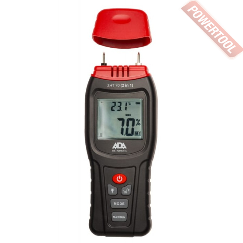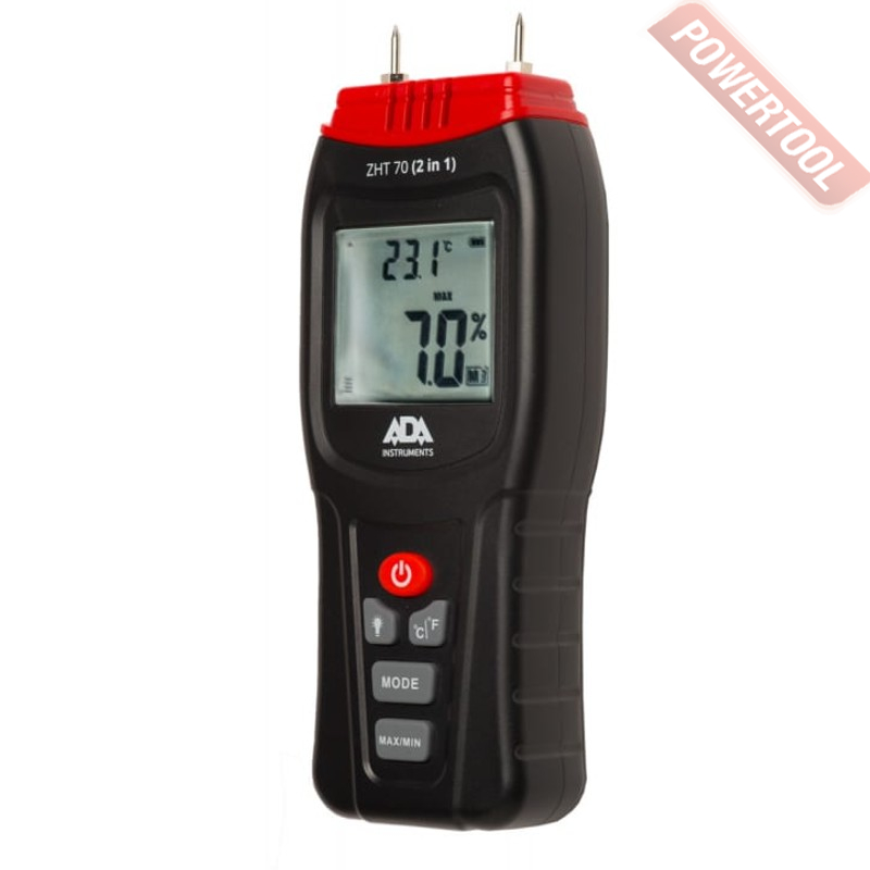Влагомер с функцией термометра ADA ZHT 70 - измеряет содержание влаги путем определения удельного электрического сопротивления материала с помощью двух электродов. Электронная схема обрабатывает полученный сигнал и содержание влаги отображается на ЖК дисплее. Используется этот прибор для измерения влажности дерева, штукатурки, бетона. Применяется в строительстве, на складах пиломатериалов, сушильных установках древесины. Одновременно прибор измеряет температуру окружающего воздуха.