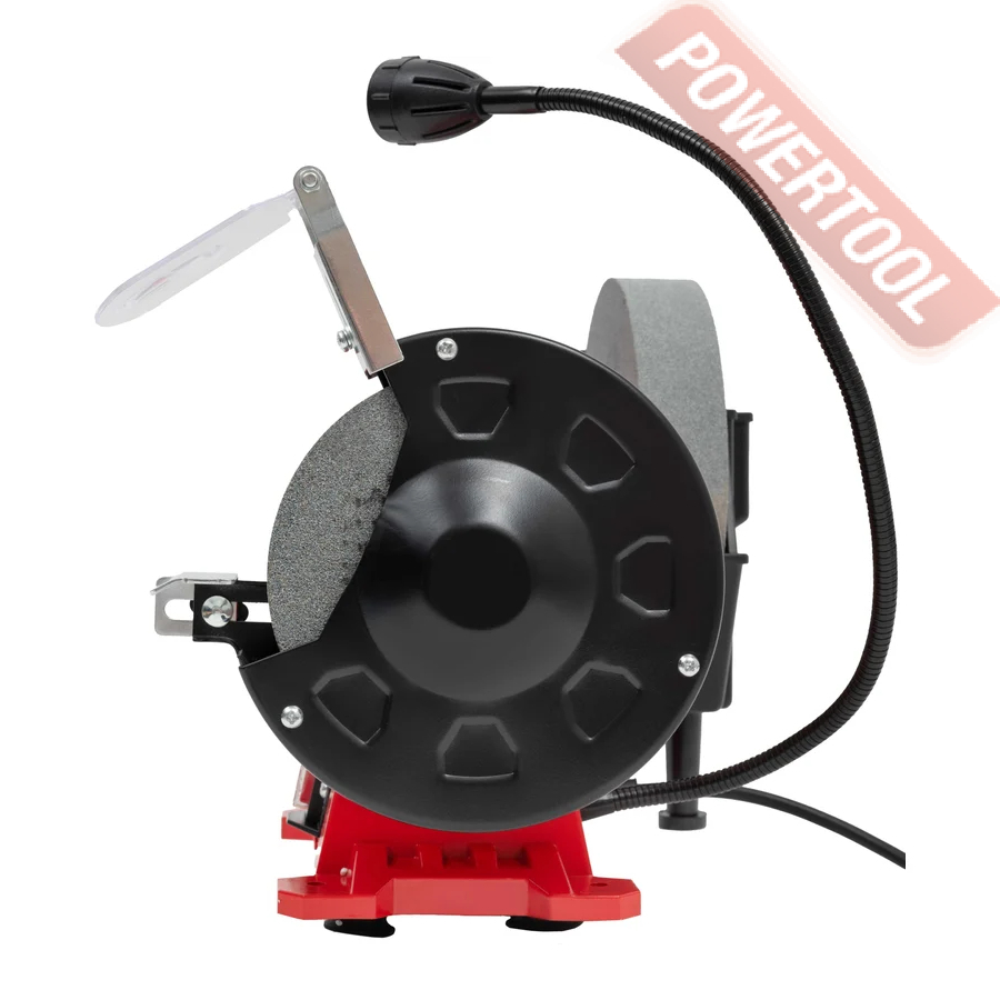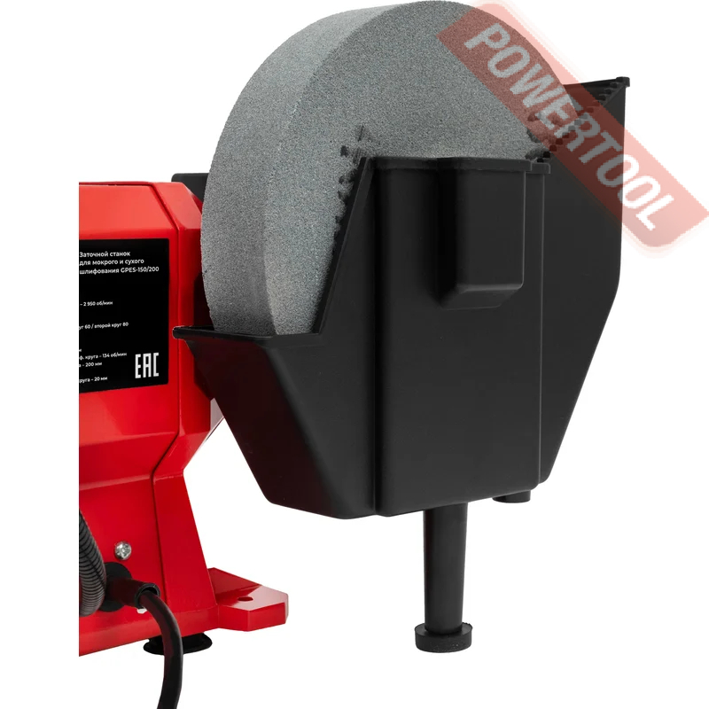 Заточной станок универсальный с двумя кругами, мощность 500 Вт, напряжение 220 В, шлифкруг 150х32х20 мм и 200х32х40 мм, водяное и воздушное охлаждение, число оборотов 2950/134 об/мин, медленный круг для мокрой заточки, защитный экран, подсветка рабочей зоны, габариты ДхШхВ 410х280х340 мм, вес 9,5 кг, шлифовальный круг 150х32х20 мм, круг шлифовальный для мокрой заточки 200х32х40 мм, ванночка для воды, переходная втулка.